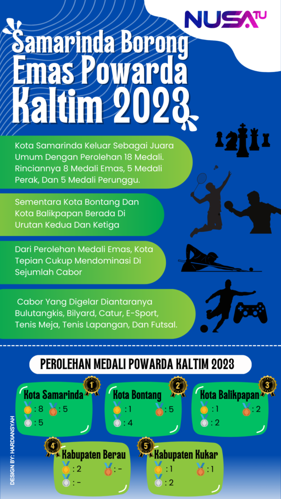 NUSASATU – Pekan Olahraga Wartawan Daerah (Porwarda) Kalimantan Timur (Kaltim) resmi berakhir Minggu 17 Desember 2023, sore tadi. Kota Samarinda keluar sebagai juara umum dengan perolehan 18 medali. Rinciannya 8 medali emas, 5 medali perak, dan 5 medali perunggu. Sementara Kota Bontang dan Kota Balikpapan berada di urutan kedua dan ketiga (lihat infografis).