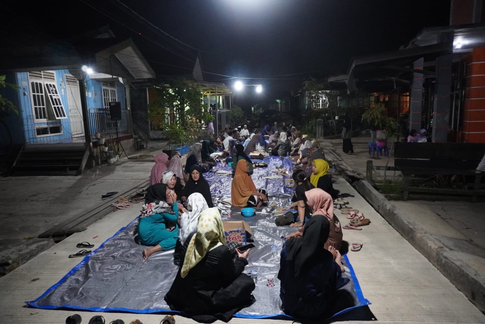 Dengan beralaskan terpal, warga menggelar tasyakuran atau selamatan, atas selesainya pekerjaan semenisasi peningkatan jalan di permukiman mereka.